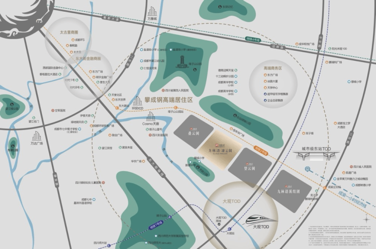 【生态配套】双公园环伺,中央公园住区距项目1公里——400余亩塔子山公园+125亩东站绿轴公园盛景,市区最大的归纳公园,东二环区域心脏方位。距项目3公里——3000亩成都最大青龙湖湿地公园,靠近天然的主城抱负日子。