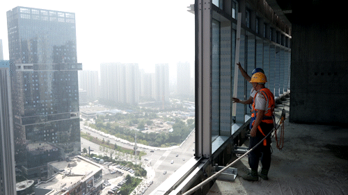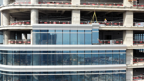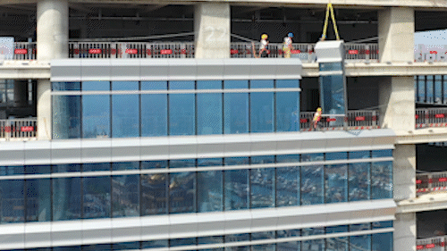 王锦海:到现在,塔楼9—11层及13—21层的单元式玻璃幕墙与金属幕墙已完结装置作业。当时幕墙板块装置严厉依照施工方案推动,以每3天完结一层的施工功率有序打开。
