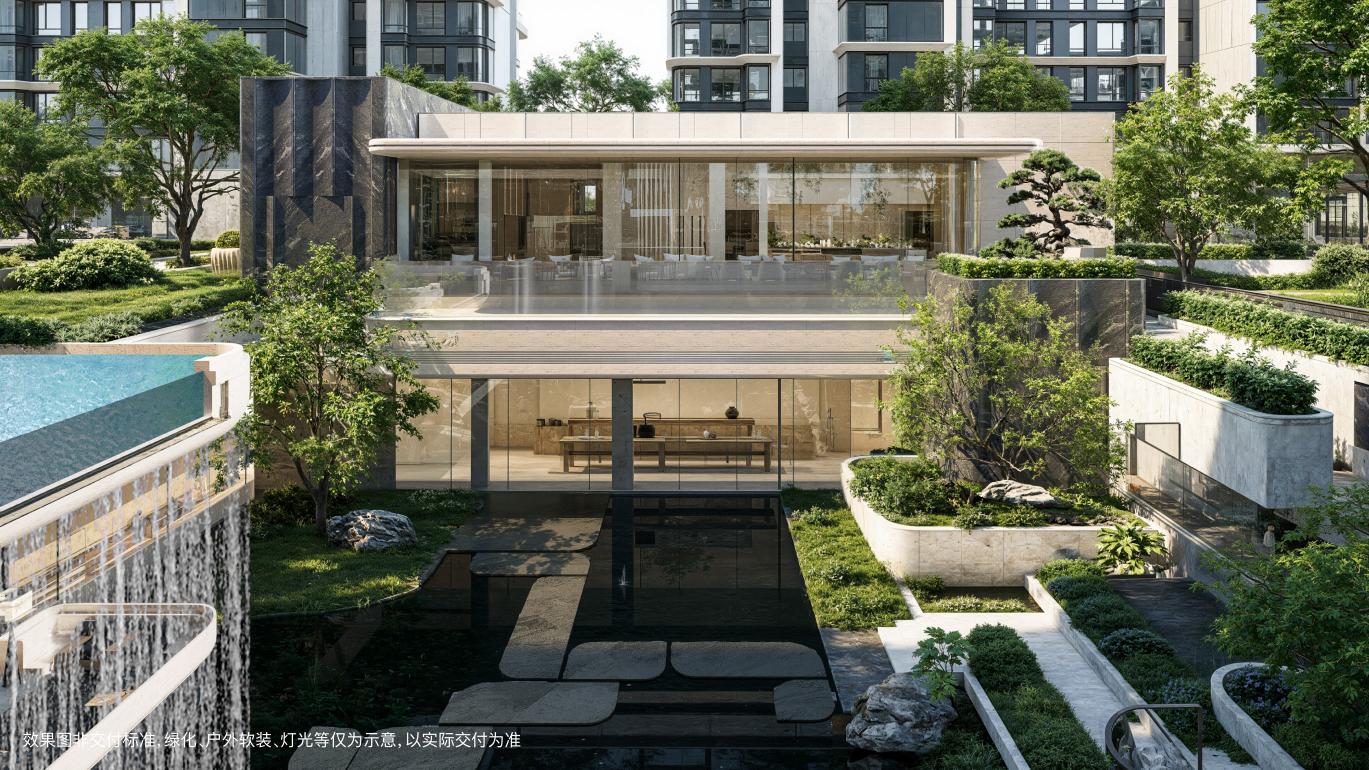 立面选用首层石材+玻璃+仿石铝板、陶板+金属格栅的高端组合,调配导弧落地窗与超大窗墙比,质感拉满。